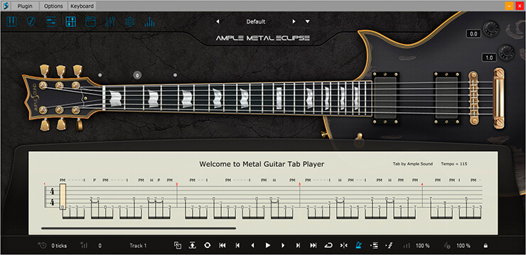 Como todos os outros plugins da Ample Sound Metal Series, a Ample Metal Eclipse integra ainda as excelentes funcionalidades do Riffer 2, FX e Tab Player (veja mais abaixo por favor o que são estas opções).