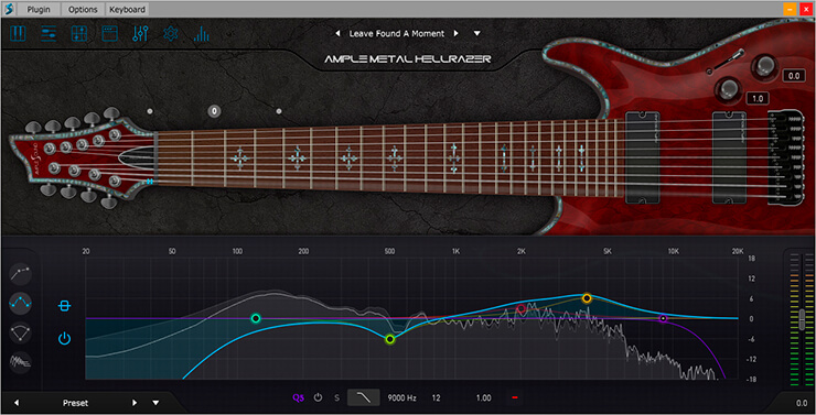 Equipada com um total de 6 amplificadores, 7 cabinets, numerosas opções de microfone, bem como EQ, compressor, eco de toque e reverberação IR, pode personalizar o som da guitarra Ample Metal Hellrazer de acordo com as suas necessidades, sem necessidade de plugins adicionais.