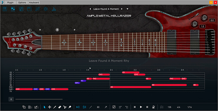 Como todos os outros plugins da Ample Sound Metal Series, a Ample Metal Hellrazer integra ainda as excelentes funcionalidades do Riffer 2, FX e Tab Player (veja mais abaixo por favor o que são estas opções).